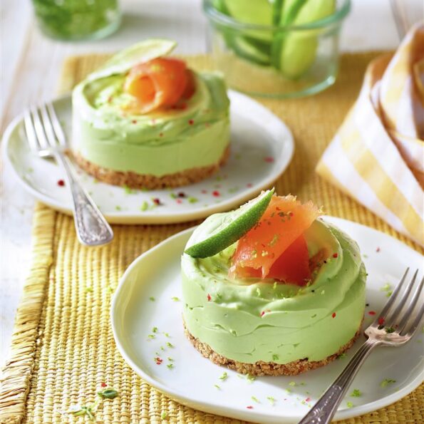 Vierte la crema en los moldes, sobre la galleta, y mételos unos minutos en la nevera para que tome cuerpo. Separa las lonchas de salmón, trocéalas y enróllalas. Retira los aros y el acetato y reparte el salmón. Espolvorea con la ralladura y pimienta rosa machacada y decora con los trozos de lima.